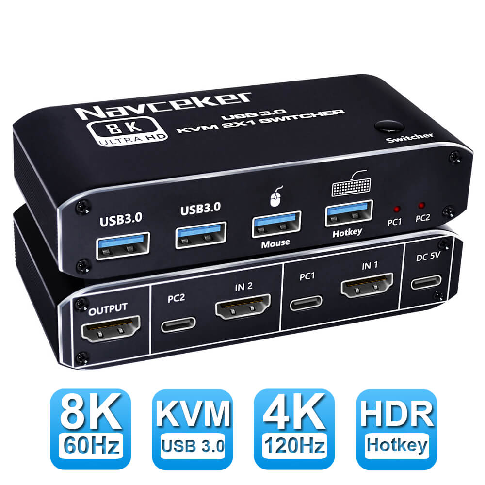 Navceker 8K 60Hz HDMI KVM Switch 2 Ports RGB 8:8:8 4K 120Hz KVM USB Switcher 2 In 1 Out with Dolby Vision/Atmos for PS4/5, PC,computer and Laptop